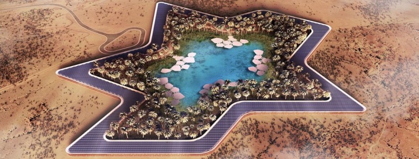 Diseñado por el estudio Baharash Architecture, de Londres, Oasis Eco Resort será sustentado por aguas subterráneas provenientes de una gran fuente que la repartirá por todo el hotel además de la huerta y los jardines; en la periferia del vital líquido, habrá 84 suites, con vistas al desierto.