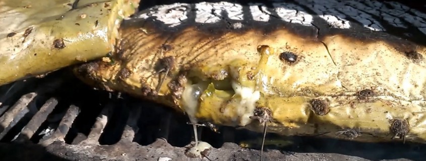 Se revuelven los nopalitos con los demás ingredientes y se rellena la penca con la ensalada. Se agrega sal al gusto y se cuece a fuego lento.